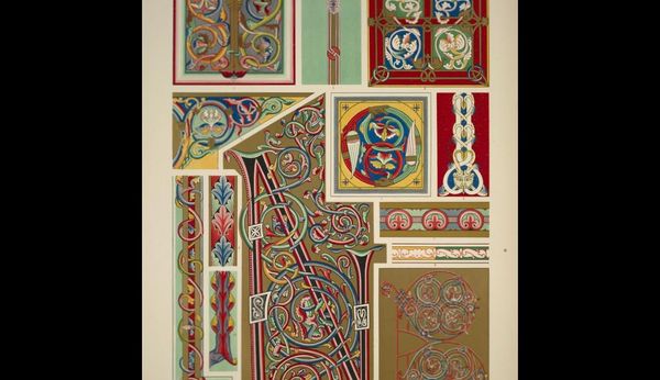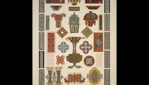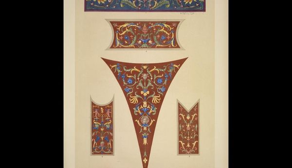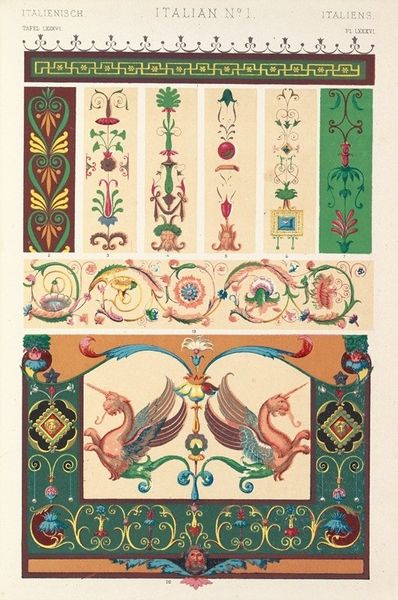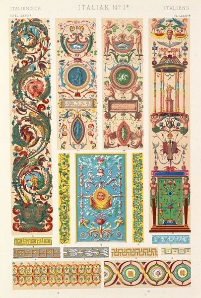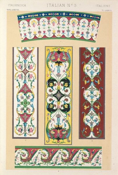 Owen Jones created this chromolithograph, “Italian Ornament no. 3,” to document patterns he saw in the Palazzo Ducale and the Church of St. Andrea in Mantua. The prints were made through chromolithography, a 19th-century technique using multiple lithographic stones, each inked with a different color, to create complex images. The final effect mimics the appearance of hand-painted designs. The meticulous process mirrors the handcraft employed in the original Italian ornaments. Jones was trying to capture the essence of Italian Renaissance design through mechanical reproduction. But don't mistake this printmaking for mere replication! The choice of chromolithography speaks to the democratizing spirit of the Victorian era, making intricate designs accessible to a wider audience. It also highlights the era’s fascination with cataloging and disseminating historical styles. Jones’s work blurs the lines between industrial production, the craft of printmaking, and the artistry of Renaissance ornament. It encourages us to think about how techniques shape our perception and understanding of cultural heritage.