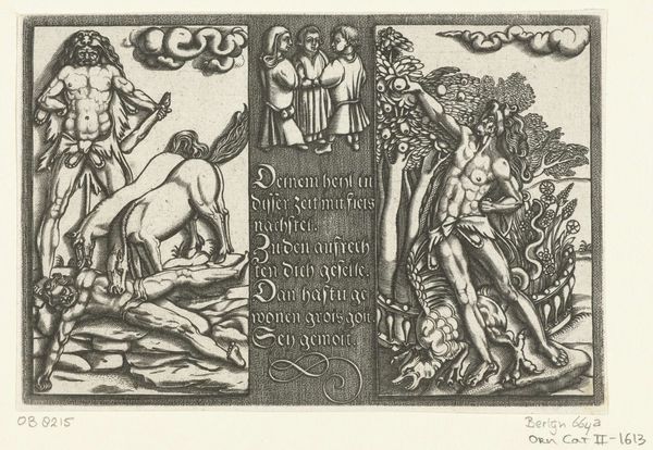 Curator: We're looking at Johann Sadeler's "Creation of Eve," made in 1579. It's currently housed here at the Rijksmuseum. What are your immediate impressions? Editor: Chaotic, but intentionally so, I think. My eye jumps between the figures of God, Adam, and Eve. There’s also this bizarre juxtaposition of nocturnal and diurnal imagery – sun, moon, and stars together! Curator: The engraving participates in a longer visual tradition. These intricate prints served to disseminate biblical stories widely, particularly during the Counter-Reformation. Notice how the style combines a Northern Renaissance interest in detail with Mannerist affectation. Editor: The composition is densely packed, almost claustrophobic. Adam's reclining pose certainly owes a debt to classical sculpture, even if his proportions feel… slightly off. The linear quality dominates, reinforced by the clear outlines and hatching, so everything is almost stylized. What statement does Sadeler attempt to make? Curator: The crowding of figures against a fully-realized landscape emphasizes the abundance of God's creation. Also, this is just a couple of decades after the start of the Dutch revolt, so many artists start creating images about moralizing messages in their works of art. It shows that everything under His command is beautiful. The animals, too, take a center stage showing an image of unity and faith. Editor: But there’s also this strange erotic charge, don't you think? Look at the way Eve is presented. The scene does underscore the beauty of the physical form. Curator: These images played an essential role in shaping cultural understanding. Prints like this gave many people access to religious narratives that they may have never seen before. Also remember, artists like Sadeler were keen on making some income from them as well and there was money to be made from religion back in those days. Editor: I still find myself circling back to that calculated, Mannerist arrangement. In isolation, these images are just about artifice. When combined with context, they offer more to consider about the people behind its creation and message. Curator: Precisely. Looking closely, we begin to unlock a deeper social significance.