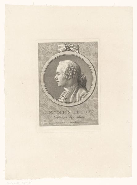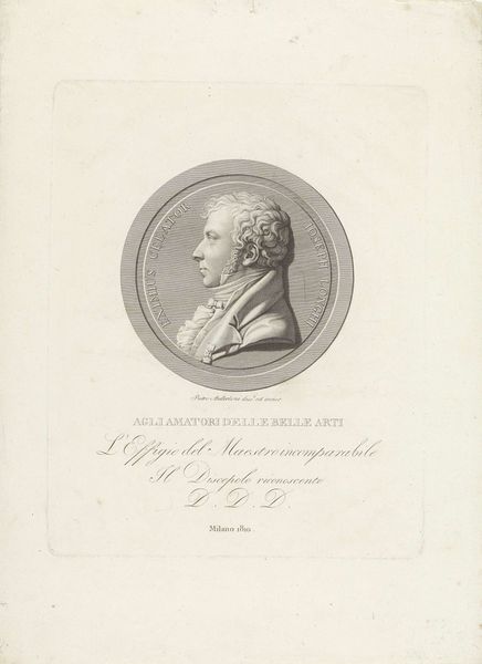 Curator: The precision of the lines immediately strikes me. It's a print by Pietro Anderloni, titled "Joseph Longhi." Note how the engraver’s tools shape the very texture of the image, the burin creating light and shadow. Editor: There is a certain formality to this piece, but it also feels like a celebration of artistic lineage. Longhi, a master, immortalized by his pupil, Anderloni, within a circular frame that evokes the classical tradition of portrait medals. Curator: The inscription beneath the portrait sheds light on this teacher-student relationship. It becomes an object lesson in craft transmission, where labor and skill are intimately tied to personal connection. Editor: Absolutely. This piece asks us to consider the hierarchies within artistic communities, the power dynamics between master and apprentice, and how these shape the creation and circulation of art. It is an intriguing intersection of skill, labor, and social context. Curator: It offers a valuable glimpse into the art world of its time. Editor: Indeed, a glimpse at the intricate web of relationships that propel artistic production.