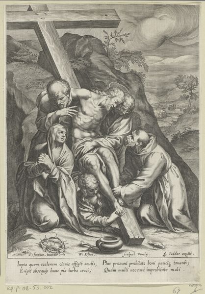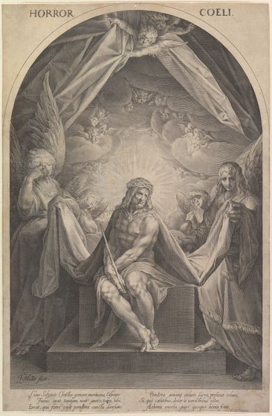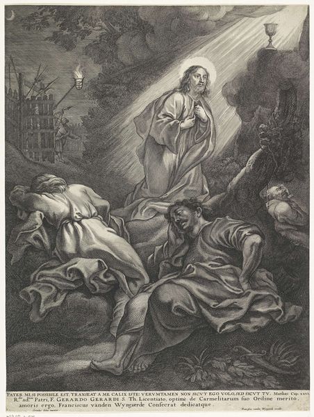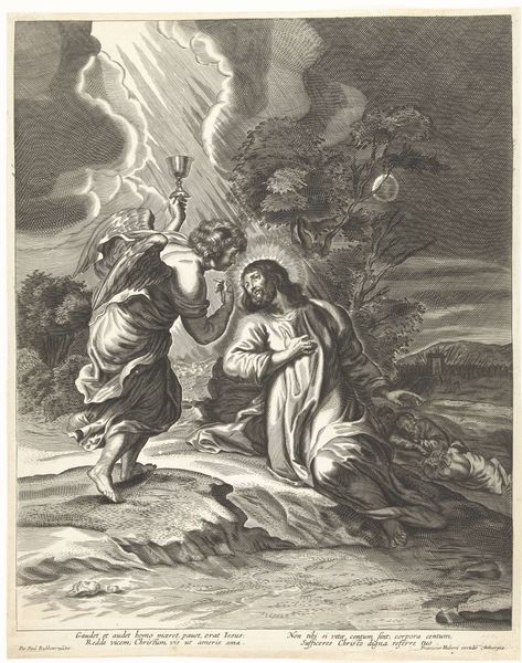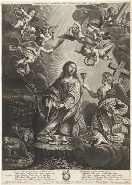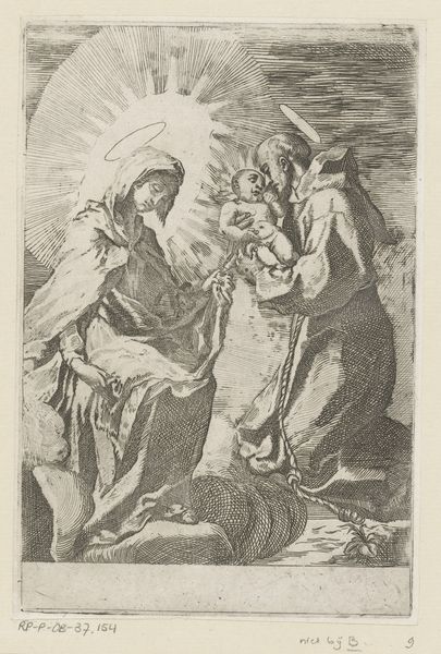 Curator: Here we have an engraving from between 1586 and 1633, currently residing at the Rijksmuseum. The piece is entitled “H. Franciscus van Assisi heeft een visioen van Maria en het Kind"—or, “St. Francis of Assisi Has a Vision of Mary and the Child.” Editor: It strikes me as quite ethereal, this whole scene feels elevated beyond earthly constraints, despite the rocky landscape surrounding the figures. Curator: The baroque style lends itself to such drama. Notice how the anonymous artist uses engraving to articulate a clear compositional structure: we have this very strong diagonal from the seated Francis on the left ascending to the Virgin and Child, drawing the eye upwards. Editor: Yes, and that light source—is it meant to be divine light?—shines rather brightly on Mary. I am particularly interested in how such intricate detailing could have been produced through an engraving process. It speaks of precision labor. One almost wonders who might have commissioned it, and the circumstances of its usage in wider society at that time? Curator: The artist emphasizes the textures, doesn't he? Look closely at the drapery, for instance. Each fold is sharply defined, almost sculptural in its form, but the visual depth of the image does add significant meaning: note the somber mood on the left against the burst of beatific energy. Editor: That sharp distinction in moods, between St. Francis contemplating mortality with rosary beads and his vision filled with light does highlight life, death and the spaces in between—it creates a poignant tension between spiritual yearning and bodily reality, what that work must have meant to individuals! I'd almost forgotten there are people working behind the scenes. The labour alone would be substantial in creating the metal plate... Curator: Agreed. From a purely aesthetic viewpoint, I'm intrigued by the balance the artist struck given the heavy symbolic nature of the subject. It's a piece that clearly communicates through contrasts, both in its formal composition and thematic concerns. Editor: It certainly brings to mind broader questions regarding devotional practice as manual labor. Let us pause on those ideas and reflect upon art.