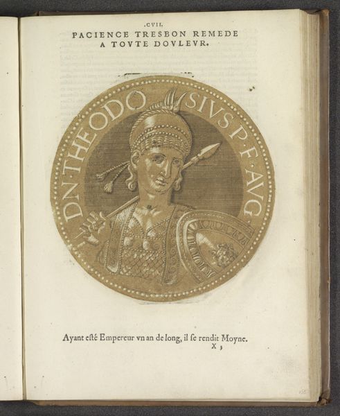 Here is the audio guide script: This is a print of a portrait of Emperor Constantine III and his son Constans II, by Joos Gietleughen. The design is dominated by a circular medallion at the center, its form emphasizing unity and continuity. The figures of the emperor and his son are presented in relief, giving them a tangible presence that contrasts with the flat background. Consider how the artist uses the circular boundary to frame the emperors, which also imposes a structure that invites a reading of power dynamics. The texture is defined by an intricate network of fine lines, creating a play of light and shadow that draws attention to the details of their garments and facial features. The lettering is arranged symmetrically around the portrait, reinforcing the formal balance of the composition. The entire image can be regarded as a visual sign, a form of symbolic communication that invites us to decode its historical and cultural meanings. The formal qualities serve not just an aesthetic purpose, but also communicate meaning about power, succession and historical memory.