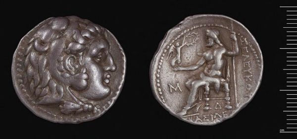 Editor: Here we have a silver Tetradrachm of Seleucus I. The imagery seems quite deliberate; who are we looking at here? Curator: Note how the portrait on the obverse bears the horns of Ammon. This immediately aligns Seleucus with divinity, associating him with Zeus-Ammon. What emotional associations does that evoke? Editor: Power, authority, maybe even a sense of timelessness? Curator: Precisely. And on the reverse, Zeus sits enthroned, holding an eagle, a powerful symbol of kingship and divine authority. Consider how these symbols work together to create an enduring image. Editor: So it's a carefully constructed message about Seleucus's right to rule. Thanks, I see that now!