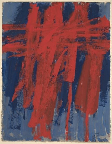 Editor: We're looking at Bracha Ettinger's "Eurydice n. 27" from 1998, an acrylic on canvas work. The striking use of red and violet hues, arranged in horizontal strokes, immediately grabbed my attention. What do you see in this piece, particularly in how the lines interact with each other and the lower register? Curator: The interplay between line, color, and texture here is critical. Ettinger employs impasto to give physical presence to each stroke. Notice how the violet hues create an atmospheric depth against the more assertive reds. It isn't just about the application of color, but the construction of visual space through these painted gestures. Editor: So the horizontality... it isn't just a stylistic choice? Curator: Precisely. The horizontality underscores the inherent flatness of the canvas. There is a conscious effort to both acknowledge and subvert the illusionistic possibilities of painting. Moreover, observe the layering and translucency in the lower register - barely visible inscriptions. How does that influence your perception of the composition? Editor: I hadn't considered that...it makes it feel like these raw colors and lines emerge from a hidden, perhaps repressed space, and the inscriptions give some linguistic structure, maybe even a narrative element, underneath it all. Curator: Indeed, this visual layering creates tension and enriches the work, transforming potentially simplistic forms into carriers of profound visual weight. Editor: Thank you. Considering this breakdown, the simplicity of the stripes isn't simple at all. Ettinger's mastery with the color composition generates an intense, emotional reaction by drawing the viewer to consider both structure and raw feeling simultaneously. Curator: Absolutely. Focusing on these formal qualities offers valuable insight, enhancing our ability to see, think about, and, crucially, feel art.