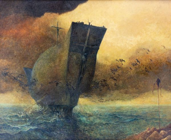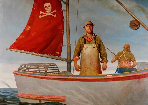 Curator: The oppressive mood hits you right away, doesn’t it? The stillness, the palette...it feels like something is fundamentally broken. Editor: Absolutely. And I think that sense of brokenness is precisely what Tetsuya Ishida wanted us to consider with "A man can't fly anymore" from 1996. It's a poignant piece rendered in oil paint, part of his broader commentary on the disillusionment of contemporary Japanese society. Curator: I see that so strongly in his merging of human and machine. It feels deeply dehumanizing, doesn’t it? Look at how the protagonist, for lack of a better word, is essentially trapped within this rusted, dilapidated contraption— a fairground ride perhaps? Editor: Yes, a Flying Ship. It’s evocative of failed upward mobility. We need to contextualize this piece against the backdrop of the 1990s in Japan, what’s often called the "Lost Decade," a period of economic stagnation following the collapse of the Japanese asset price bubble. The collective optimism of earlier decades had soured into anxieties about employment, purpose, and identity. Curator: Ishida perfectly encapsulates that feeling. The yin-yang symbol on the boat is oddly unsettling and might suggest the tension between tradition and the pressures of globalization at the time. Editor: Exactly, and think about the formal elements. The muted color palette, primarily browns and grays, contributes to a sense of dreariness. The figure is not centered, not heroic, but slumped, almost defeated, as if giving up the possibility of "flying." Ishida consistently portrayed these liminal characters; they capture a sense of social alienation felt by many in modern capitalist societies across the world. The artist even included the flying ship trademark along the wheel with his classic mascot adding another dimension to the dark nature of this piece. Curator: You're right; the symbolism is layered and complex. The painting is a stark reminder that progress and success are not always guaranteed. What does remain however, is our shared condition as beings caught up within these kinds of structures. Editor: Absolutely. And to that point, even decades later, this oil painting forces us to confront our contemporary anxieties.