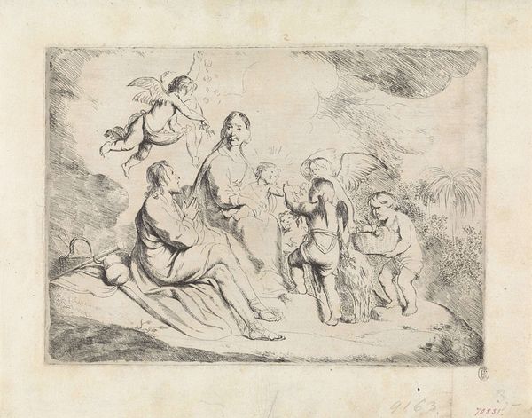 Curator: Here we have "Saters en nimfen," or "Satyrs and Nymphs," an ink drawing made with pen created sometime between 1750 and 1800. It resides here at the Rijksmuseum. Editor: It's…chaotic. Like a bacchanal distilled into monochrome. So many babies! It's intriguing, but what’s immediately striking is the frenetic energy held in check by the classical composition. Curator: Yes, it's a very dynamic composition. Look at the groupings, the clear allegorical references to fertility and abundance. This piece fits neatly into a Baroque tradition of celebrating classical myths. Consider the social context. These playful mythological scenes were popular in a society embracing increasingly secular ideas but still enamored with classical aesthetics. Editor: It makes me wonder about the intent. Is this just an exercise in academic skill, showcasing knowledge of classical themes? Or is there a subversive element? The overabundance feels…almost satirical. Is it a comment on the burden of motherhood, or the excesses of the aristocracy? Curator: Perhaps both. The ambiguity is part of its strength. Artists were often commissioned by wealthy patrons, and while they certainly had creative license, their work was often tied to specific agendas, expressing or negotiating contemporary norms through classical subjects. Editor: I’m curious about the satyrs themselves. Their hybridity, half-human, half-animal, has always been a potent symbol of transgression. And here, surrounded by so many innocents, what does their presence signify? Curator: That’s an interesting point to make. We can see the clear binary opposition of nature and culture, the rational versus the instinctual, or order opposed to chaos. By representing it, society at the time attempts to exert symbolic control of this idea, domesticating it to an extend, which the placement within the picture emphasizes. Editor: Ultimately, I find it fascinating how this image teeters on the edge. It hints at liberation, even hedonism, yet it's contained within a framework that seems designed to maintain social order. It raises more questions than it answers, which, in my book, is a mark of compelling art. Curator: I agree, the complexities of this work make it all the more interesting. It's a reminder that even seemingly straightforward classical imagery can be a site of negotiation, reflecting the social and political currents of its time.