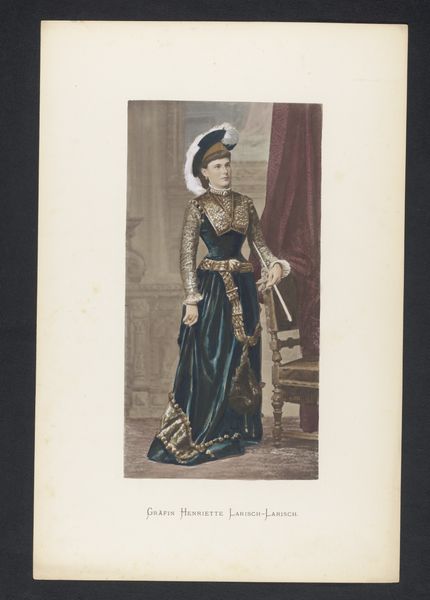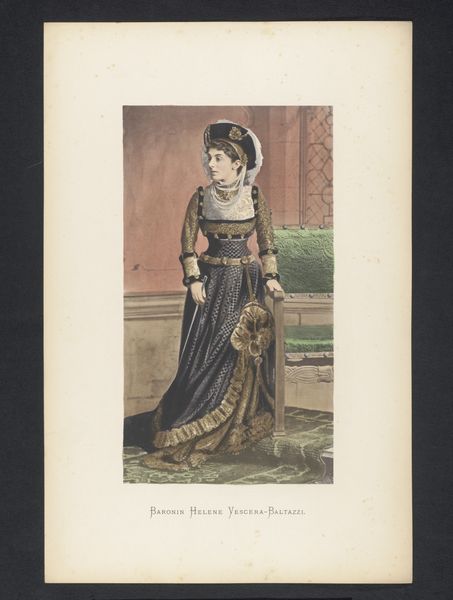 This is a portrait of Countess Eveline Baltazzi by an anonymous artist. It presents us with the iconography of aristocracy and refinement: a grand architectural backdrop, a fountain suggesting leisure, and the Countess herself adorned in exquisite detail. Consider the checkered floor beneath her feet. This pattern, reminiscent of masonic floors and ancient Roman mosaics, transcends mere decoration. It speaks to a duality, a balance between opposing forces—light and dark, conscious and unconscious, a symbolic stage upon which life's dramas unfold. The column recalls classical antiquity, a symbol of stability and order, yet here, it is softened, almost overtaken by the natural world behind it. These motifs, echoing through the ages, point to our collective memory. Like actors in an eternal play, these symbols resurface, their meanings shifting with each generation, each new context. They resonate within us, these visual echoes.