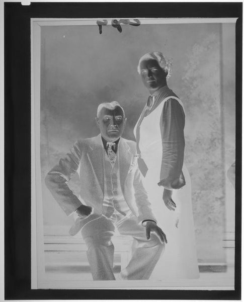 Curator: This is John Deusing’s Untitled photograph of two men and two women in formal wear, part of the Harvard Art Museums collection. Editor: Striking! The stark tonality creates an almost ghostly, ethereal quality. Curator: Indeed. The negative image format emphasizes the social conventions of early 20th-century formal portraiture, while also subverting them. Consider the implications of a family commissioning such a work; it's a document of social standing. Editor: I'm drawn to the composition. The subjects’ arrangement, almost symmetrical, creates a formal visual language. Note the women seated with large hats and full dresses, with the men posed stoically behind them in suits. Curator: It certainly speaks to a structured social order. The studio backdrop further frames the subjects, placing them within a carefully constructed visual narrative. It begs the question: what societal values were at play? Editor: It seems the contrast between light and dark highlights the figures, imbuing them with a unique sense of presence, despite the unusual medium. Curator: A remarkable piece for understanding both photographic techniques and the societal norms of its time. Editor: Precisely. The way the artist balances form and photographic innovation adds an intriguing layer to its interpretation.