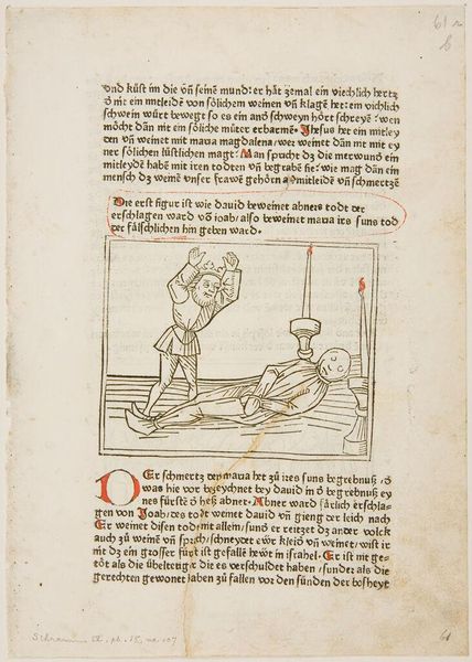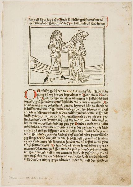 Editor: This woodcut, "Saul plans the Death of David; verso: Cain slays Abel," is an early print. The angular lines and stark contrast create a rather ominous mood. What do you see in this piece? Curator: Indeed. Note the deliberate use of line to delineate form, especially in Saul's robe. The composition is carefully structured to emphasize the tension between the figures, a clear visualization of power dynamics. Editor: So, you're focusing on the formal elements to understand the narrative? Curator: Precisely. The artist’s choice of medium – the woodcut’s inherent starkness – reinforces the gravity of the biblical scene. The reverse side even depicts Cain slaying Abel, an additional layer of meaning adding to the overall composition. Editor: I hadn't noticed the link between the two stories! It highlights the theme of betrayal. Curator: Exactly. By analyzing the form and structure, we unlock narrative and meaning, viewing historical context to add another layer.