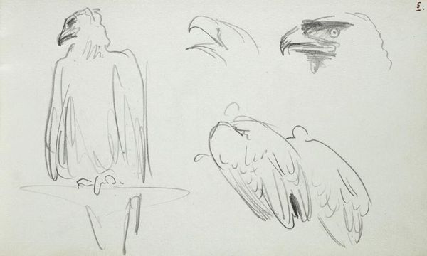Curator: We're looking at John Singer Sargent's "Two Sketches of a Bird," residing at the Harvard Art Museums. It measures a modest 12.6 by 21 centimeters. Editor: Immediately, I’m struck by the raw energy of these pencil lines. It feels so immediate, like catching a fleeting moment. Curator: Precisely. Notice how the composition directs the eye—the implied lines of the wings converging, creating a dynamic tension within the limited field. Editor: And the paper itself—you can almost feel the texture. Pencil sketches like this offer insight into Sargent’s working process. It makes you wonder about the kind of pencil he used, the weight of the paper. Curator: An interesting point! It is the stark interplay of positive and negative space, the deliberate economy of line, that defines its formal strength. Editor: Perhaps. But for me, it's about capturing a living thing. The slight awkwardness, the impression of movement... it's more than just lines, it's life! Curator: A lovely perspective, emphasizing the vitality embedded within the form. Editor: It does remind us that even in the sketch, there's a record of labor and intent.