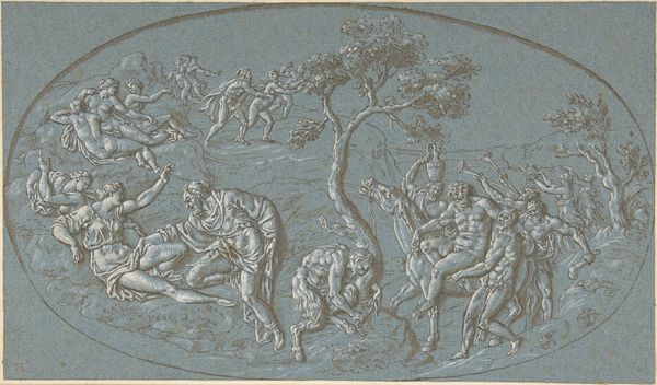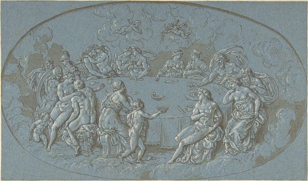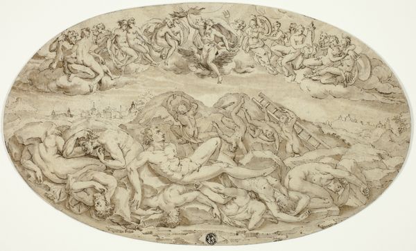 Curator: This is "Fall of the Giants," a drawing and engraving created between 1693 and 1733 by Bernard Picart. It resides here at the Metropolitan Museum of Art. Editor: My first impression is one of immense drama and almost dizzying movement. The swirling figures above and the toppling giants below create a strong sense of chaos and defeat. Curator: Absolutely. Picart has employed a baroque style to convey this chaos. Note the dramatic contrast of light and shadow and the exaggerated musculature of the figures. We can examine the linear quality of the engraving, especially when we think about the paper itself as a commodity, how that process impacts art consumption. Editor: The composition is remarkable. The artist cleverly uses the oval shape to divide the heavens and earth. How the composition uses the vertical space to create that dynamic sense of falling? Curator: The depiction of nudes also ties into broader social themes about morality. Picart’s technique here tells us a lot about labor standards, as the act of engraving was physically grueling. This helps to give a better sense of the history surrounding how the artist crafted it. Editor: Thinking about materials, the contrast between the soft cloud formations above and the jagged rocks below creates textural variety that is compelling. There are compositional parallels and balances to notice across these visual elements. Curator: I agree. Looking more deeply at the allegory, we can see representations of morality in tension between labor and history during that era of artwork production. This makes for a better reading of themes around allegory at play in the drawing itself. Editor: Overall, the powerful narrative and striking visual language create a memorable impression. The dynamism holds our attention even centuries later, due to the sheer amount of information. Curator: Examining this work illuminates not only the talent of the artist but the whole set of human power and value judgments behind artwork production, allowing for a deeper reading into themes of that era. Editor: Agreed, by considering the relationships of the lines, shapes, and forms within it, we gain a more complete viewing experience.