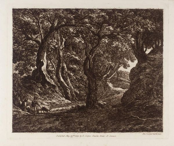 Editor: Here we have Paul Huet's "Women Bathing," an etching on paper from 1867. I'm immediately struck by how the density of the lines creates a palpable sense of enclosure, almost a hidden world. What do you see in this piece? Curator: Well, I see an etching, a medium reliant on the collaborative efforts of labor. From the artisan preparing the metal plate, to the printing press workers. Consider, too, the socio-economic position of these bathing women – are they workers, or from the leisured class? The material production and consumption intertwined here reveal fascinating power dynamics of 19th-century society. How does the depiction of the landscape inform this interpretation? Editor: That's interesting. I was focusing more on the contrast between the almost wild nature and the figures, but framing it in terms of labor changes the perspective. So, the deliberate use of etching, a process involving specific materials and a chain of production, becomes integral to understanding the artwork's message? Curator: Precisely! We need to consider what the choice of etching signified in the context of mid-19th-century printmaking. Etching, unlike some quicker reproductive methods, involved craft skill and knowledge. It speaks to the conditions of artistic production at that time. Was it commercially viable, or was it an aesthetic exploration of materiality and method for Huet? Editor: So, it's less about the romanticism and more about... the means of creating that impression of romanticism. That completely reorients my thinking. Curator: Absolutely. Romanticism here could be viewed as another 'material,' constructed by the very hands involved in its making. The human labour becomes explicit! Editor: It really forces you to look beyond just the subject matter. Curator: And it demonstrates the artist’s own participation in the material world, as much as his subjective vision of it. A vision, importantly, produced through tangible actions.