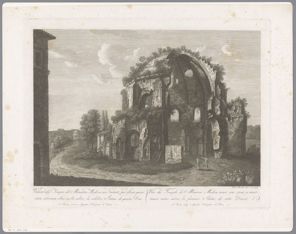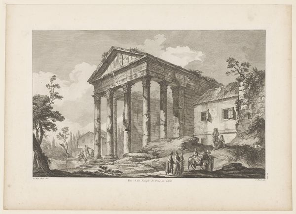 Curator: This print from 1797 by François Morel is titled "Gezicht op de Tempel van Vesta," or "View of the Temple of Vesta." Editor: It's quite striking! The monochromatic palette evokes a feeling of antiquity and timelessness. The architecture dominates, doesn’t it? Curator: Precisely. Note how Morel utilizes engraving to create depth and texture, highlighting the architectural forms. The play of light and shadow accentuates the cylindrical temple. The precise rendering invites a sense of classical order and stability characteristic of Neoclassicism. Editor: Absolutely. One can see the layers of labor in its construction—quarrying the stone, the assembly… I imagine the engraver facing similar challenges of material transformation. The print’s stark contrasts reflect the physical effort to turn raw materials into art, and art into accessible visual information for a wider public. Curator: Intriguing! I see your emphasis on the work behind it all. The composition is carefully structured. Observe the relationships between the temple, surrounding ruins, and figures, and note how their geometry conveys an idea of permanence despite decay. Editor: Yet that decay adds another layer, right? Consider how the engraver depicted that crumbling masonry, perhaps with cheaper tools as they got to the edges, showing some accelerated use in his engraving. Was he alluding to societal shifts and challenging those neoclassical ideals by revealing material deterioration? Curator: Interesting perspective. While the print does evoke a melancholic mood perhaps alluding to passing empires, to me, Morel's meticulous detail immortalizes the classical structure, creating a testament to ideal form. Editor: Indeed! For me, looking at its aged materiality, reminds one of those people at work behind the original buildings themselves, not just idealizing it. Still, an evocative artwork, viewed from different angles.