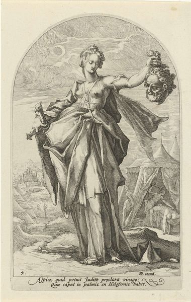 Curator: This watercolor and ink drawing from between 1752 and 1819, attributed to Jurriaan Andriessen, depicts Judith with the Head of Holofernes. What are your initial impressions? Editor: My immediate reaction is subdued. The colors are muted, almost faded. It doesn’t scream baroque drama, but whispers it. There’s a rawness in the sketchy lines that feels more like a study than a finished work. What draws you in? Curator: Absolutely. The emotional weight for me is tied to Judith as a symbol – a righteous actor. It’s interesting to see her depicted with such… reserve. Usually she is an avenging power. She transcends any one particular cultural milieu because she keeps coming up in diverse contexts as a heroic figure. Editor: Yes, but look at how Andriessen renders her garment: quick, almost impatient strokes, but with variations in the ink hinting at volume. This piece probably served a direct purpose in the artist's studio, guiding another's process, maybe even to serve a theatrical set. See the script in the corner? Mes or Ayer…it is difficult to determine who owned this work, who the subject was or is referencing in the caption. I suspect a production by its appearance in this style. Curator: You might be onto something about the set. These muted colors can bring her back to the material reality that it takes for the image of power to coalesce, don't they? Even if the reference is personal. Editor: Exactly. And the act itself—beheading Holofernes—a raw act of physical labor rendered here not as an explosion of passion but with quiet pragmatism in this work, which is so revealing. It asks us to consider all that happens on set and backstage! Curator: A fitting reminder that symbols are made, not born, often springing out of communal labor and out of historical reference! Editor: And of the incredible things people make behind the scenes, without the claim of masterpiece or the noise of authorship.