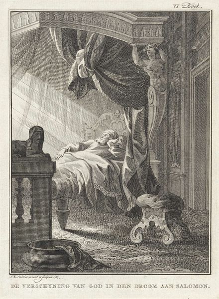 This is Reinier Vinkeles’ engraving, “Sterfbed van Salomo”, or “The Deathbed of Solomon”, made around 1781. Notice how Vinkeles uses the contrast of light and shadow to draw our eyes to the figure of Solomon. His bed is the focal point, surrounded by mourners. But Solomon isn't the picture of tragedy; instead, he's depicted with one arm raised, perhaps in a final blessing, suggesting a sense of acceptance or even triumph over death. The composition and structure are striking. The artist uses linear precision to render the scene, but what stands out is how Vinkeles plays with the idea of representation itself. Solomon is idealized—a wise king passing peacefully. Yet, this idealization invites us to reflect on the themes of power, mortality, and legacy. The piece challenges us to look beyond the surface, probing into the underlying structures of meaning and representation. Consider how its forms and lines suggest that death is not merely an end, but a moment of profound cultural and philosophical significance.
