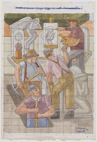Editor: Here we have William Roberts’ "Model on a mattress," from 1975. It’s got this really interesting, almost clinical feel, with the grid overlaying the scene of the model and the artists. What do you make of this piece? Curator: It’s like peeking into the artist's mind, isn’t it? The grid, almost like a scientific observation, contrasts beautifully with the intimate, messy reality of the studio and the creative process itself. Notice how the figures seem trapped within the grid's confines, yet they're also creating something outside of it. What do you think this suggests? Editor: Maybe it's about the struggle to reconcile structure and freedom in art? I appreciate that observation. Curator: Absolutely! Roberts beautifully explores that tension. It's a constant dance between order and chaos. Editor: I see it now. Thanks for illuminating that. Curator: My pleasure! It’s always fascinating to find new layers in familiar works.