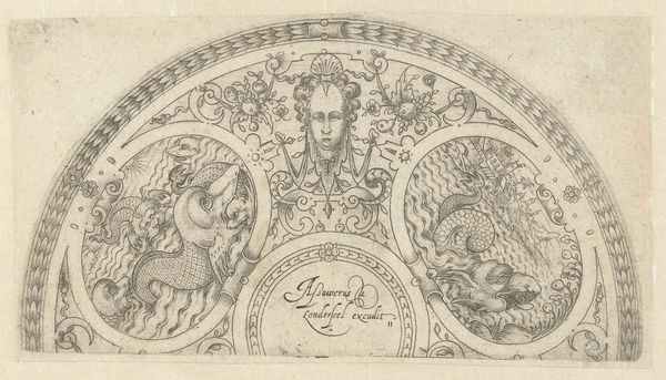Editor: This intricate engraving, titled "Decoratie voor de rand van een schotel," is estimated to have been created between 1500 and 1635 by an anonymous artist. I’m struck by how the composition, though small, feels monumental, like a tiny window into a vast mythological world. How do you interpret the symbolism embedded within this decorative piece? Curator: This engraving speaks to a cultural memory deeply invested in myth and adornment. Notice the prominent aquatic creatures; in many cultures, water signifies the subconscious, the source of life, and untamed potential. Are they monstrous? Playful? How do the figures interact with their watery realms, and what feelings do they evoke? Editor: They’re definitely ambiguous, teetering between beautiful and monstrous. It feels intentional, almost dreamlike. The juxtaposition of the grotesque sea creatures with the delicate floral designs seems contradictory. Curator: Precisely! This visual tension is key. The floral patterns offer beauty and order, a counterpoint to the primordial chaos suggested by the marine imagery. Think about the intended function—a decorative border. Is it meant to elevate mundane objects, offering glimpses into other worlds, or does it remind the diner that order is always under threat? The symbolism connects us to long traditions of maritime narratives and ornamentation. Editor: So, it’s not merely decorative but a container of deeper meanings, pulling in the viewer’s own interpretations? Curator: Exactly. Its power lies in its ability to evoke subconscious associations, triggering a chain of cultural and personal interpretations about history, life, and even mortality itself. What does this engraving, in its totality, say about you? Editor: I suppose it reminds me that beauty and chaos can, and often do, coexist. Thanks, that’s a perspective I hadn’t considered! Curator: And for me, it reinforces the enduring power of symbols to transcend time and connect us to shared human experiences.