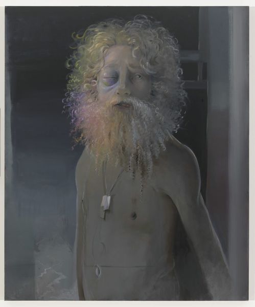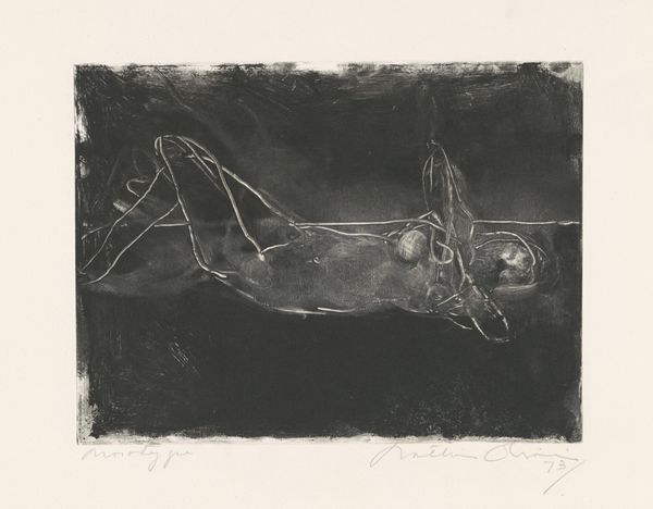 Editor: This is "He foresaw his pale body" by Richard Hamilton. The figure's distorted pose in the stark white tub creates a rather unsettling feeling. What compositional elements stand out to you? Curator: Note the stark contrast of light and shadow; the pale figure dominates against the murky ground. The artist presents the composition almost as a study in the tension between the geometric precision of the tub, and the organic form of the figure, dissected by implied planes. Do you see how this fractures the conventional reading of the form? Editor: Yes, the tension you mention is clearly visible. I hadn't considered the interplay of geometric and organic forms. Curator: Considering the composition, the figure's pose and the work's title, it allows a unique reading, which is the result of this artistic study. Editor: That’s a great insight. Thanks for expanding my understanding!