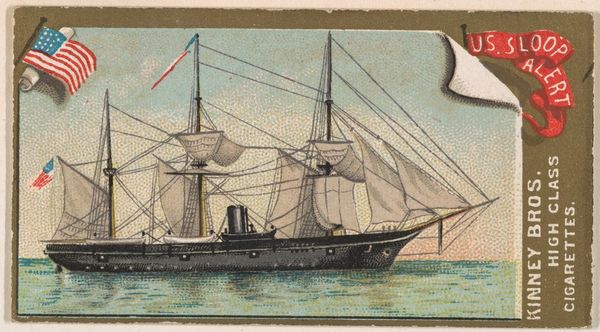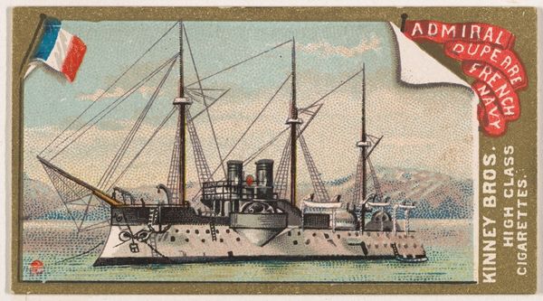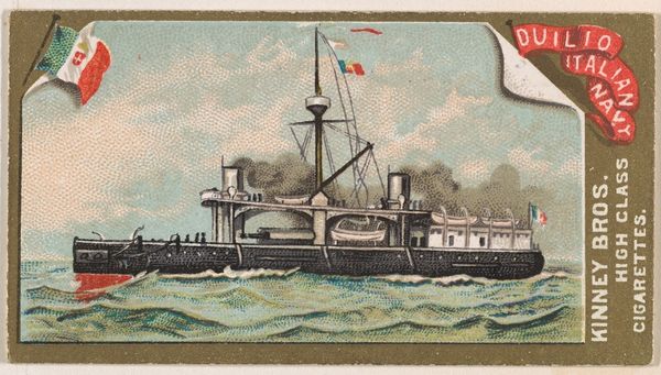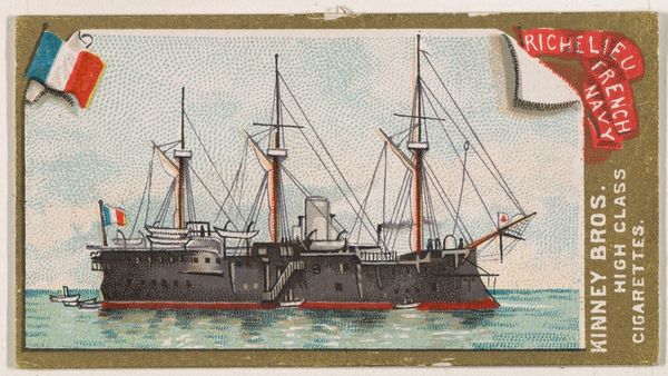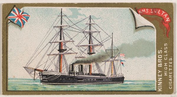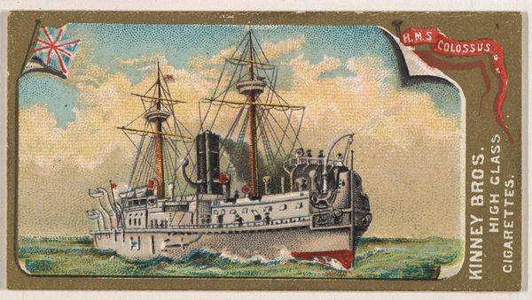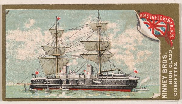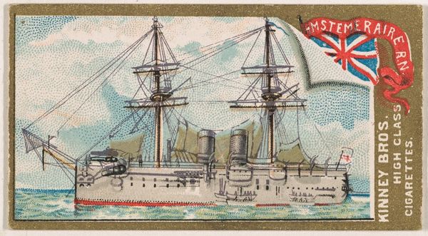 Editor: This chromolithograph from 1889, "H.M.S. Jumna," was made by the Kinney Brothers Tobacco Company as part of their Naval Vessels of the World series. It depicts a British Royal Navy ship against a pale sky and sea. I find the image rather quaint, almost dreamlike. What do you see in this piece? Curator: I'm struck by how this seemingly simple image functions as a cultural shorthand. The ship itself, meticulously rendered, speaks to Britain’s naval power and global reach during the late 19th century. But it is more than just documentation. Note how the Union Jack prominently flies—not just as a flag of identification but as a potent symbol of imperial authority. The image, circulated through tobacco cards, became a form of popular propaganda. Editor: Propaganda through a cigarette card? I never thought of it that way. Curator: Precisely. The 'innocent' depiction reinforces a national identity, associating the viewer with a sense of maritime prowess. Also, consider the typeface chosen for the ship’s name—slightly whimsical, softening the military connotations, further normalizing the imperial project. Do you notice how this romanticized image of the ship contrasts with the realities of naval warfare and colonial exploitation? Editor: I see what you mean. It's a cleaned-up version of reality. Like a memory, almost? Curator: Exactly. It performs the crucial function of constructing and reinforcing cultural memory. The very act of collecting these cards imprinted these ideals onto a generation, contributing to the era’s collective psyche. This little card then, carries an ocean of historical and cultural meaning. Editor: It's incredible how much history is packed into such a small image. Thanks, I have learned so much about seeing images beyond the surface. Curator: The pleasure was mine; exploring these layers together has been very enlightening.
