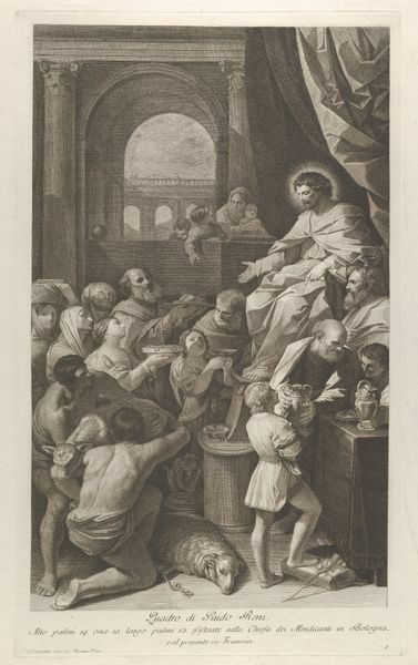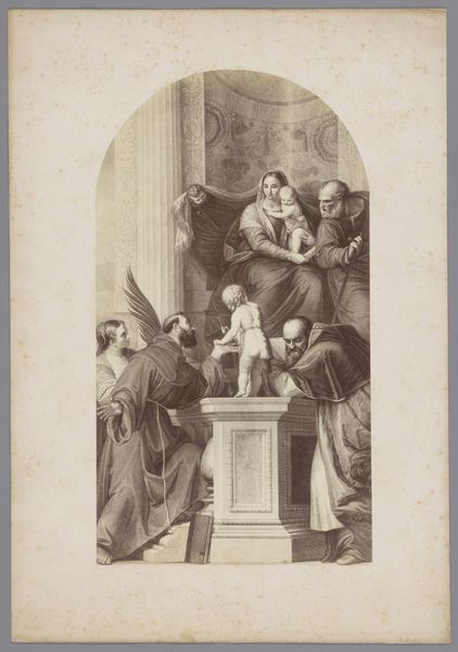 Editor: Here we have "Fotoreproductie van het schilderij De laatste communie van de heilige Franciscus van Assisi, van Rubens", a print on paper made sometime between 1858 and 1866. The somber sepia tones and the subject matter create a deeply spiritual mood, I think. What do you see in this piece, beyond the obvious? Curator: Ah, yes! This piece transports me. It's more than just a reproduction; it's a gateway, don’t you think? You feel the echoes of Rubens' original Baroque drama. Consider the light - it struggles against the shadows, much like Saint Francis at his final communion. But beyond the visual story, the very act of creating a photomechanical print introduces another layer, it brings into question originality versus reproduction and speaks of faith being disseminated widely. It reminds me of when I tried to photograph my dreams once. Did that capture them, or create something entirely new? What do you make of that dynamic at play here? Editor: I never thought of it that way – it *is* interesting to think about the many layers of reproduction at play! This work does makes me think about how images influence our understanding of religious events. I guess seeing something is not always believing! Curator: Precisely! The layering of imagery changes its context and meaning. Plus, it reflects our human need to grasp the intangible. It makes me wonder - in seeking to record or reproduce what is "true," are we just recreating the world according to our own filters and projections, always slightly askew from any "original?" Editor: I hadn’t considered the implications of replicating a historical scene. It is like a game of "telephone", with the original being so far away from this print on paper! Curator: Yes, and this print becomes something new, separate from the origin of the painter, something special!