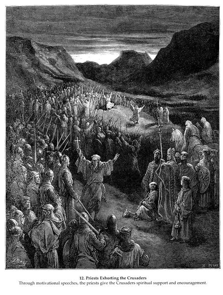 Curator: This densely detailed engraving by Gustave Doré plunges us into a moment freighted with the pathos of war. Editor: The composition strikes me immediately – this stark contrast between the clustered figures and the bleak emptiness surrounding them. It's a very effective way to showcase despair. Curator: Indeed. The artwork is entitled "Godfrey Meets the Remains of the Army of Peter the Hermit." Doré was, of course, a master of Romanticism, lending himself to dramatic historical subjects such as this encounter during the First Crusade. Editor: Tell me, looking at the formal elements—the strong, definite line work contrasted with the subtler gradients—what impact do you believe Doré was aiming to produce with this choice of engraving versus, say, painting? Curator: That's astute. With the engraving, Doré isolates each figure in a field of action—there is clarity amidst chaos, if you will. There's no obfuscation of character by, say, brushwork. Doré heightens emotional intensity here, I feel. It allows him to play on our perception of each individual, as each man registers defeat or disbelief in equal measure. And let’s not neglect the effect Doré gets from his monochromaticism. How does that add, do you suppose? Editor: Oh, significantly, for sure. By eliminating color, the print emphasizes the scene's stark emotional climate. Light and shadow symbolize a struggle between survival and loss of hope as it visually communicates desperation through the defeated bodies. The monochrome is very economical and very expressive, working in tandem. What strikes me most profoundly is not simply that these men have fallen, but that so many men of faith succumbed to their deaths in battle on the Crusade—such a powerful and troubling message. Curator: Doré used his artistry, regardless of medium, to tell a moral tale through human drama. Each line appears purposefully drawn to enhance narrative depth and imbue with a unique emotional tone; an artwork that, even divorced from historical considerations, carries considerable weight, doesn't it? Editor: Precisely. It transforms the historic, recorded event of warfare into a symbolic landscape mirroring both internal and historical struggle.