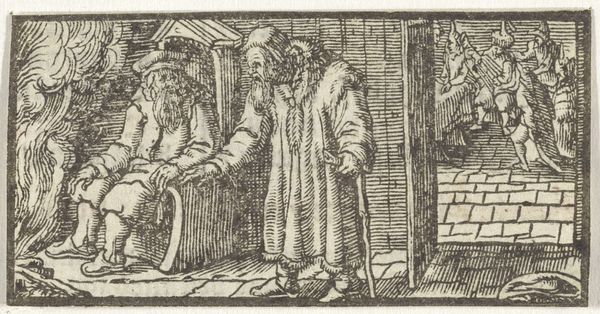 Curator: This is "Januari", a 17th-century print rendered as a woodcut in ink, from an anonymous artist. The distinct linearity immediately strikes me. What’s your initial take? Editor: Spare and pragmatic. The starkness, coupled with the subject matter, whispers of winter's functional necessities: labour, craft, a struggle against the elements and, perhaps, a battle with loneliness. Curator: Indeed. Observe how the composition, through the orchestration of contrasting dark and light fields, delineates two distinct domains within the confined space. One is devoted to manual work: the man, absorbed, perhaps mending tools; the other centers on domestic craft, as signified by the woman at her spinning wheel. Editor: The wheel feels particularly potent here, doesn’t it? Throughout so much visual culture, the spinning wheel is emblematic of fate, the turning of time, but also industry. She is not passively waiting but actively shaping the course of things through skill and industry. Curator: Note as well the division created through line. The architectonic structure creates spatial recession through a succession of oblique parallels and perpendicular intersections; in doing so, it creates pictorial tensions – each zone of action visually counterbalances. The artist has clearly adopted geometric order here to describe volume. Editor: I’m also drawn to what we can’t see in full. A figure lingers, half obscured at the entrance, and is this, maybe, a pagan icon hovering over them both? So much symbolic density, considering its relatively minimalist presentation. Even the hanging spoon speaks to provision and care. Curator: Your focus on symbols is spot-on. We see this stark woodcut capturing ordinary life of labouring and living. There is a profound visual integrity. Editor: Definitely, I found myself drawn in and left contemplating how these intimate spaces encapsulate an entire cultural landscape in just a few lines. Curator: Quite right. A testament to how visual codes and geometric forms shape our understanding of even the most quotidian scene.