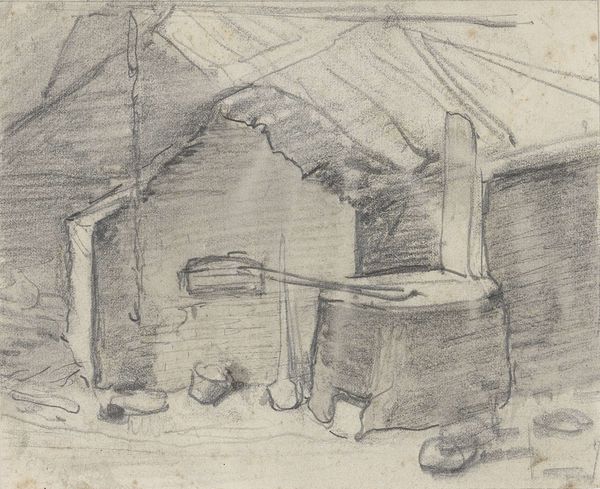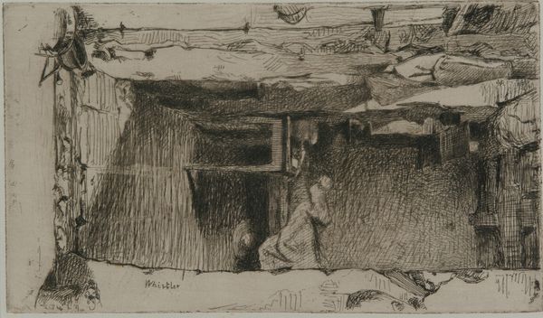 Curator: Look at the somber mood conjured up by this Whistler print. Editor: Indeed. This etching, completed around 1858-59, is titled "The Miser." It's a compelling example of Whistler’s early experimentation with the etching technique. But the name makes me think - miser, as in stingy? What's being conveyed here, beyond some dark interiority? Curator: Consider how the light interacts with the window's geometry, almost cruciform, casting a contemplative mood over the solitary figure looking outward. The shadow feels oppressive, as if an exterior presence threatens this isolated sanctuary. Light is used symbolically here as the miser’s last grasp on an uncorrupted, sacred self. Editor: Perhaps, but I read the shadowed figure not as clinging to sacredness, but as being enclosed by poverty. Whistler produced this etching during a period of great social inequality. Look how that large table dwarfs everything else, a sort of "Last Supper" table without a feast. Is he hoarding space, experience? He’s shut off, visually and, probably, economically. Curator: Notice also how the composition leads the eye inward. The items affixed to the upper left, perhaps utensils, are potent visual reminders of shared meals now past. Could these imply the true treasures he withholds – sustenance, connection? This image echoes cycles of loss, and what rituals can ease despair. Editor: That's an interesting counterpoint. And in this context, it points out what this individual cannot or will not participate in. We could even view the composition of the table and figure as symbols that reinforce social alienation, of individuals and a class separated by wealth, resources, power. Curator: A powerful reading, emphasizing the external forces at play on this person. It shifts our perception, revealing nuances of social injustice alongside personal reflection. Editor: Absolutely. Viewing artwork as a dialogue with past struggles is necessary work that allows a clearer understanding of ourselves. It provides both empathy and strategies. Curator: Exactly! Perhaps both approaches are helpful. Appreciating the aesthetic craft—and probing at the piece’s relationship to its broader cultural moment opens paths to layered insights.