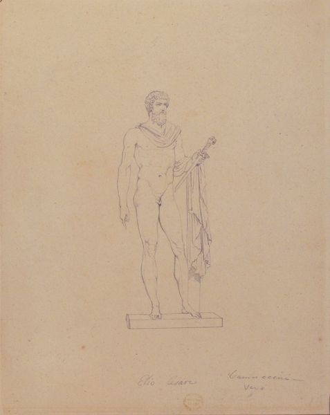 Curator: It has a slightly mournful quality to it. There's a tiredness in the subject's posture despite his clear muscular physique. Editor: You've zeroed in on an interesting observation. We're looking at "Hercules met attributen", a drawing attributed to Isaac Weissenbruch. While the exact dating is somewhat broad, it's believed to have been created sometime between 1836 and 1912. Currently, it resides in the Rijksmuseum. Curator: The line work is really fascinating. It looks as though he was workshopping the hero's design, maybe an idea generation for a much bigger and far more impressive work. Pen and ink would give you the control to quickly make sketches and ideations. Editor: That speaks to the crucial role these types of sketches had on academic art during this era. It showcases Weissenbruch’s engagement with classical ideals, right? Curator: Yes! Think of the context around that era; to be an excellent artist required mastery in both drawing and understanding ancient masterpieces of art. It allowed artists to create in both realistic and imaginative genres. This process created works that could easily resonate in social contexts of the time period. Editor: And this also indicates Weissenbruch’s investment in a particular image of masculinity, right? Hercules, beyond just being a hero, was a symbol of strength, resilience, and even virtue – values often upheld and certainly scrutinized within 19th-century social structures. Curator: I agree. There is a potential commentary on social expectations. But it looks also like that he enjoyed experimenting with Hercules. The line qualities are not perfectly even; they suggest he was focused on what he can achieve with a single sheet of paper rather than committing to flawless artistry. Editor: Well, I think that contrast, the unfinished quality alongside the monumental subject matter, it forces us to confront the complex layers inherent in image production, historical ideals and maybe even the socio-political function that art played during that period. Curator: A thought-provoking reminder that every stroke carries cultural weight, and we can re-evaluate conventional materials through their interaction within societal conditions. Editor: Absolutely, this single drawing offers much more than a glimpse into one artist’s sketchbook. It unveils art’s function and power in the nineteenth century.