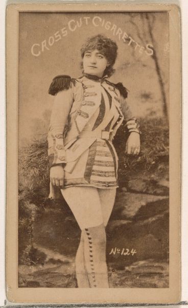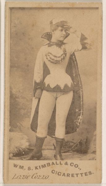 Editor: We are looking at “Miss Viden, from the Actresses series,” created in 1889 by Wm. S. Kimball & Co. It’s a small print, a portrait. The actress has a dreamy air, holding a drum in a rather jaunty outfit. What leaps out at you when you see it? Curator: Oh, it’s a curious little thing, isn't it? To me, it whispers of backstage magic and manufactured fantasy. She's not quite in character, nor entirely herself – she’s suspended between realities, caught in the liminal space between the stage and the cigarette card. Do you see the artifice in her stance? Editor: Definitely. The backdrop looks so generic, and the outfit seems almost theatrical. Is there a tension here between reality and performance? Curator: Exactly! Kimball and Company were essentially selling a carefully constructed dream. The "actress" becomes a commodity, a collectible, simultaneously elevated and objectified. And that costume… does it strike you as historically accurate or purely theatrical? Perhaps they just tossed together a ‘historical’ mishmash from central casting! Editor: Good point! It seems less about historical accuracy, more about creating a visually striking image that would sell cigarettes. Curator: It all boils down to illusion. These cards offered people a miniature world of glamour they could hold in their hands. So much fantasy wrapped up in something so small, it almost tickles! What do you make of that faraway look in her eyes? Editor: Maybe she’s lost in thought, picturing the play’s narrative or just…bored. It’s interesting how such a mass-produced object can still invite speculation. Curator: Precisely. Even though designed as mere advertisement, these cards are a portal into a fascinating sliver of cultural history and human dreams. See, now we are creating new narratives for poor Miss Viden, a double trick!