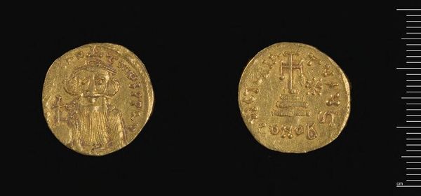 Editor: This is a gold coin, the Coin of Herakleios, struck by Abd-al-Malik of the Umayyads. It's fascinating how such a small object can carry so much history. What do you see when you look at this coin? Curator: I see a direct record of cultural appropriation and material transformation. The coin's gold content speaks to trade networks and resource extraction. The imagery, clearly mimicking Byzantine coinage, points to a deliberate manipulation of visual language for economic and political power. Editor: So, the value isn't just monetary, but also symbolic? Curator: Precisely. The coin embodies a struggle over resources and representation, where materiality and imagery become tools in asserting dominance and establishing a new cultural order. Editor: I never thought of it that way. I guess I was focusing on the image of the coin, instead of what it represents as a whole.