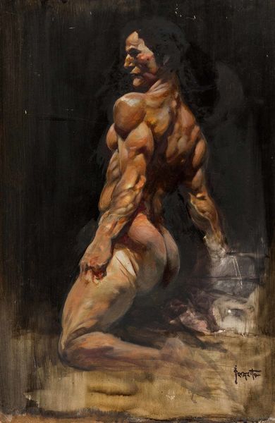Frank Mason made this painting, "Standing Figure, Back View" with oil paint. The figure emerges out of this sea of dark, almost like it's being born right in front of us. Look at the way Mason uses these earth tones – browns, umbers, maybe a touch of gold – to create a sense of depth and mystery. You can almost feel the texture of the paint, thick in some areas, thin and transparent in others. See how he builds up the form with these small, broken strokes? It’s like he’s sculpting the figure out of light and shadow. I find my eye being drawn to the back, which is the focal point, the light really hits that spot. Mason seems to be echoing the old masters like Rembrandt, but with a more modern sensibility. And it reminds me a little bit of Auerbach, in the way he's wrestling with form and representation.
