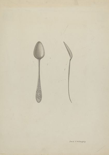 Curator: This watercolor and graphite drawing is called "Rug Hooks" and was created around 1941 by Mary Fitzgerald. What are your first thoughts on the piece? Editor: There’s a kind of quiet simplicity here. The composition, a vertical stack of utilitarian objects, is quite striking, focusing your attention on line, shape and form. There’s not a lot of dynamism; the colors and textures seem muted. Curator: Absolutely, and understanding the object represented here is important. The rug hook allowed for the repurposing of textiles, typically scraps of fabric, clothing, and worn household items into something new. Fitzgerald is depicting tools of domestic labor, transforming the scraps of capitalism, the remnants of use, into aesthetic order. Editor: I appreciate that context. The rendering itself is precise; the wooden handles have a beautiful tonal range, contrasting with the sharp lines of the metal hooks. Tell me, does her process reflect these means of production that you've been talking about? Curator: Fitzgerald’s technique and skill, though seemingly straightforward, also speak to this transformation, highlighting labor through representation and elevating utilitarian objects into something of aesthetic value. Editor: Well, I must say, for me, Fitzgerald transforms these mundane objects through a studied sense of balance and composition into pure form. Her controlled watercolor washes give the drawing a tactile quality, hinting at the textures of the wood and metal. I like the negative space. Curator: What I think we’re seeing is Fitzgerald taking the very materials and the means of production from craft traditions and presenting it on par with "high art." We cannot disassociate her artwork with its historical context: craft production, textile consumption and the work inherent in creating art or rugs! Editor: It’s remarkable how Fitzgerald draws attention to everyday beauty. Focusing on formal and representational strategies opens a rich dialogue between art and lived experience, don't you think? Curator: Exactly! The artwork functions as both artifact and aesthetic experience. Editor: On the one hand we see an appreciation for visual economy; the other, for repurposed creation, and it is compelling. Thank you for sharing that with me. Curator: Likewise, our conversation really enlivens my appreciation for Fitzgerald's elegant aesthetic.