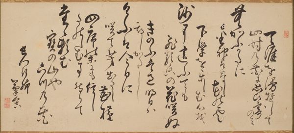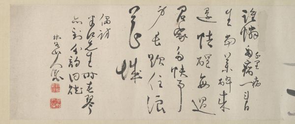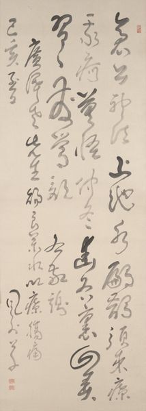 Curator: Let's discuss this intriguing work titled "Autumn View," created around the 18th century by Gion Nankai. It's an ink drawing on paper, presented as a hanging scroll. What are your initial impressions? Editor: The calligraphy is captivating, an intricate landscape of marks. It feels immediate and gestural, a direct channeling of energy onto the paper. The materials – ink, paper – they speak of a simple yet demanding practice. Curator: Nankai, deeply versed in Confucianism and Zen Buddhism, uses this form of art to weave a philosophical statement on man and nature. Can we decode a dialogue here? Editor: Absolutely, consider the materials themselves: the absorbency of the paper dictates the flow of ink. The tools, the wrist’s gesture, create these forms we interpret. Labor is intrinsic. How does this physical action affect the text’s overall narrative? Curator: The work is more than merely writing or visual art. The writing becomes the picture; it dissolves dualities. A certain freedom exists, which may be linked to escaping social constraints through scholarly activity. What are your thoughts? Editor: There's certainly a tangible interaction happening. From production to reception, it prompts a meditation on the transient qualities of autumnal landscapes, linking them to a historical time and space through his labor. Curator: Right. In Nankai's era, the work critiques established social structures. It examines cultural exchange with China and also speaks to issues such as seclusion and philosophical pursuits—elements often interwoven with politics. It asks us to rethink not just artistic processes, but societal structures. Editor: Precisely. Looking at it this way allows for reassessment not only from formal standpoints but across historical circumstances surrounding production too, adding complexity, challenging art historical norms in useful directions. Curator: A deeper look encourages a consideration of art beyond form, inviting reflection upon life. Editor: Indeed, engaging directly allows questioning of how social contexts drive meaning making within artworks through an attention towards how process shapes outcome; thank you for elucidating, a valuable way seeing!