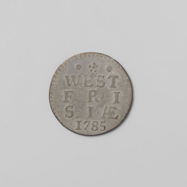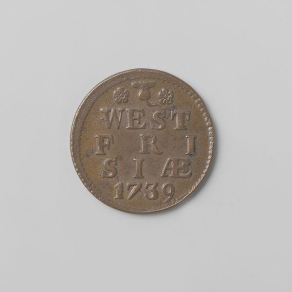 Curator: This is a Westfriese Duit, a coin minted in 1739 in West Friesland, which is a region in the province of North Holland in the Netherlands. It’s struck in silver, or what’s known as 'afslag in zilver.' Editor: It looks so worn. A relic of a world rapidly transforming. Looking at it, I think about value; both monetary, and the symbolic weight it carries now, almost three centuries later. Curator: Exactly! These coins are more than just currency. They represent West Friesland’s participation in global trade during the Dutch Golden Age, and their own regional identity. You can see the words “WEST FRISIAE” clearly embossed. Above those words, are what appears to be decorative florets. They signify regional prosperity and a desire for local autonomy in this era. Editor: That's interesting that you note that flourish. The desire for autonomy rings loud now. Thinking about trade and autonomy during the 18th century in the Netherlands inevitably calls to mind Dutch colonial endeavors at the time. So many objects like these belie complex and contradictory political realities. The aesthetic sheen masks centuries of exploitation. What stories could this small piece of silver tell? Curator: Certainly, currency always raises questions about colonial exchange, however, in this instance, the emphasis on the coin is more about localized value than extraction or global networks. Note the date—1739. The coin's symbology relates more to establishing West Friesland's place within the broader Dutch Republic at a pivotal time of economic transformation and artistic innovation than to Dutch overseas operations. The engraving evokes symbols that held immense emotional value for people living in that specific time and location. Editor: True, these localized symbols, that attempt at cultivating a sense of shared cultural belonging—the coin itself might have functioned as a form of early propaganda? Who handled it? Whose pockets did it line? Its physical presence tells the story of a tangible connection to that region’s historical narrative. Curator: Precisely. And while diminutive, it mirrors so many grander themes of trade, autonomy, and cultural identity—echoes resonating even now. Editor: Thinking about the economic landscape and localized impact gives it this unexpected contemporary edge—in terms of global debates surrounding localized value. It highlights how everyday artifacts gain layers of meaning. Curator: Indeed, a potent, pocket-sized history lesson!