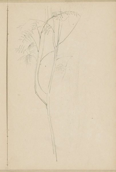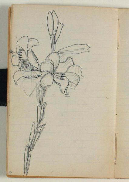 Curator: Here we have Niels Larsen Stevns' "Blomsterstudie," dating from 1937-1938. It's currently held at the SMK, the Statens Museum for Kunst. Editor: Immediately striking. Such delicacy rendered simply in pencil on what looks like standard notebook paper. There’s a rawness that speaks volumes about process, the immediate capture of an observation. Curator: Indeed. Consider the context. Stevns, deeply involved in the Danish art scene, made this study amidst rising socio-political tensions in Europe. How does the simple subject matter reflect, perhaps, a desire for the tranquility of the natural world in contrast to impending upheaval? Editor: That connection between socio-political context and materials is critical. It feels very immediate. We are given to wonder, how the availability of certain paper affected how the art piece itself was crafted and presented within those contexts. It’s not high-art canvas, it’s a readily available resource – reflecting potentially both necessity and accessibility. Curator: Precisely. The very act of sketching in pencil allows for spontaneity, a direct link between the artist's eye, the subject, and the page. This intimacy encourages us, the viewers, to imagine the moment of creation and it makes this drawing very charming to a public that lived through political turmoil. Editor: It makes us also think about the means of artistic labor. This wasn’t something created in a rarefied studio but more like sketched out somewhere, on site. So, how did the means of the flower's capture shift how it was presented? And ultimately affect how accessible art would be? Curator: An interesting point. Did he present the drawing in any meaningful venues, though, to enhance the public experience or awareness around similar creations? Editor: Perhaps not deliberately or widely. Perhaps for his studio members? But the accessibility of the materials still signals something significant. Curator: Well, regardless, the composition's raw elegance resonates even now. I wonder, looking at his other landscapes, did they hold as much potency through similar sketching processes as did this beautiful creation. Editor: Perhaps that ease is itself potent and worthy of further exploration through the material. The social context, plus material, means process became an inextricable ingredient of it’s lasting impact.