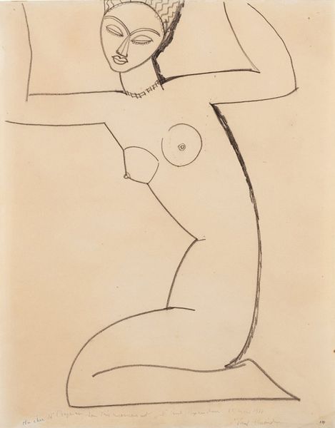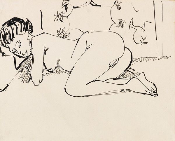 Curator: Immediately, I sense a kind of wistful solitude. A minimalist stage—just bare lines defining a body amidst stark forms. Editor: Well, let’s delve a little deeper into what we’re actually looking at. This is "Erna Lying on the Beach among Rocks" by Ernst Ludwig Kirchner, created in 1912. An ink drawing, full of swift, decisive marks. Curator: Decisive, yes, but almost vulnerable in their starkness. It evokes that solitary, dreamlike state where the body blurs into the landscape, you know? Almost yearning for something just beyond reach. Editor: That vulnerability you’re sensing might stem from the Expressionist lens through which Kirchner was viewing the world—capturing raw emotion rather than realistic form. Nudity, rocks, all these become signifiers of the exposed self, really. Curator: Right. The rocks, in this context, become less about literal geology and more about a symbolic boundary, or a place of both protection and exposure. Notice how they echo the figure's curves and angles, suggesting a harmonious, yet subtly strained relationship. Editor: Harmonious strain, I like that. His linework seems to revel in imperfection, dodging complete contours as though striving for raw emotion rather than visual perfection. I'd say he sees Erna not merely as an individual, but rather something bigger; almost universal, in that state of pensive relaxation. Curator: It touches on this primordial connection. Human, body, landscape...the lines speak a simple language to represent essential truths; how we navigate space, how our bodies carry stories—every stroke, then, a tiny psychological map. It hints that the personal is intricately entwined with our wider, lived environment. Editor: What a fantastic summation! Well, after a mindful observation, the sparest of strokes really opens a door into the world of Expressionism and emotional cartography. I like it so much. Curator: I fully agree! I'm now wondering whether I feel less alone on the beach now, with Erna lying amongst those Expressionist rocks.