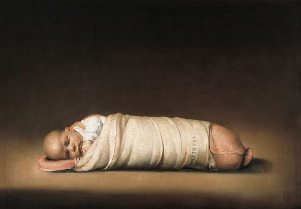 Curator: This piece, titled "Untitled," was created by Morteza Katouzian in 1990, using oil paint as his medium. Editor: It's undeniably intimate. The soft light and focus on the sleeping child create an atmosphere of peace, almost fragile in its tranquility. Curator: The composition, with its dramatic chiaroscuro, owes much to Baroque painting and portraiture. Katouzian’s technical skill evokes the intimate genre paintings favored by a bourgeois class in the 19th century. It also carries implications about representations of children within the Iranian diaspora. Editor: You're right. I'm particularly struck by how this representation avoids the prevalent Western fetishization of childhood innocence, that's very visible when considered against art-historical references. The child, sleeping soundly with its pacifier close by, has a universality that resonates beyond cultural boundaries. Is the work perhaps commenting on socio-economic struggles impacting Iranian children during this period, with a perspective emphasizing resilience? Curator: The symbolism of sleep, the discarded pacifier...they speak to vulnerability, but also, perhaps, the shedding of an earlier dependence and maybe a growing sense of self. The artwork situates childhood and questions of selfhood within a nexus of global issues. The almost sculptural treatment of the child against a very dark background accentuates the importance and the political weight of the young subject's developing consciousness within the framework of Realism and Iranian portraiture of this time. Editor: The fact that it's untitled invites interpretation. Does the ambiguity extend the themes—migration, diasporic identity, the vulnerability of children globally, their endurance within complex geopolitical dynamics—beyond specificity? Curator: Absolutely. The title absence encourages the viewer to look beyond the literal representation, allowing them to project their own associations and narratives onto the scene, underscoring childhood experience worldwide as a politically charged act. Editor: It's interesting to consider its historical moment, how it anticipates current debates on identity politics, art, and cultural agency. A testament to the power of painting to invite thoughtful consideration and question inherited cultural structures, perhaps.