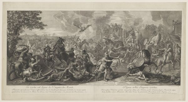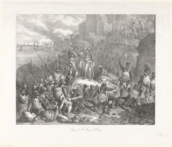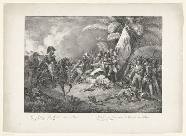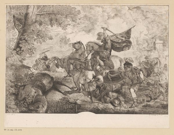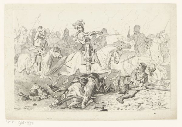 Curator: This is “Veldslag,” a battle scene print created sometime between 1818 and 1876 by Carel Christiaan Antony Last, housed here at the Rijksmuseum. Editor: My initial impression is one of controlled chaos. Despite being monochromatic, the etching conveys the drama and intensity of the battlefield. There’s a palpable sense of movement and desperation. Curator: The artist’s choice to render this historical tableau in print, using both etching and engraving techniques, is quite telling. Prints allowed for wider distribution and the cultivation of national sentiment. Consider its potential audience—would these prints serve to glorify war? Editor: Precisely. We must examine this artwork through a critical lens, beyond face value. It might seem like a straightforward representation of bravery, but it inevitably intersects with power dynamics, national pride, and perhaps even justifications for violence. Curator: You make a compelling point about its dissemination. This artwork presents a seemingly Romantic vision of war, appealing to emotion and offering a certain perspective. But how might viewers from marginalized communities or occupied nations interpret this "veldslag"? Editor: Their perspective would be drastically different. What about those whose lives and lands are destroyed in these battles? We need to challenge the heroic narrative that may be manufactured through art and propaganda, or explore the narratives that counter that narrative through resistance art. Curator: Absolutely. By acknowledging this multiplicity of viewpoints, we can encourage a more nuanced interpretation. The social and historical framework of the art’s production informs, but does not prescribe, its viewing. Editor: Yes, so we acknowledge the romanticized or glorified perspective of it all. That we question what isn’t show, and center the experiences of those who are most impacted by war. With these contexts in mind, this piece can spur dialogue that bridges then and now. Curator: Exactly. Reflecting on all of this brings me a fresh view and respect of what is being done and a consideration of how such historical accounts are framed in nationalistic discourse. Editor: Me too! These dialogues highlight the continuing significance of historical context when considering our global community through art.