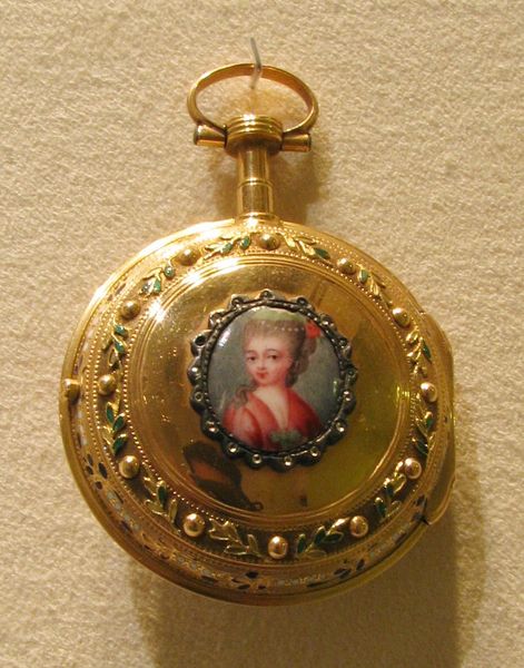 Curator: Take a moment with this "Watch", a true masterpiece of decorative art dating between 1825 and 1845. Its delicate painting and metalwork now reside at the Metropolitan Museum of Art. What do you think? Editor: Oh, my! It’s so ornate, almost ridiculously so! Like time itself is wearing a tiny gilded ballroom gown. The scene on the face, a miniature portrait—are those lovers escaping a burning building? Or maybe just…relocating. Curator: The scene's meaning is more elusive than the details, which is characteristic of decorative art of that era. We can consider this piece within broader historical narratives surrounding labor and the market economy in the early to mid-19th century. Such luxury goods symbolize specific social identities. Who would carry it, what statement would this luxury item represent? Editor: Exactly! It's saying, "I have so much time and wealth, I can encase time itself in ridiculous levels of beauty." And the figures inside… their expressions are so vague, it could mean anything! Though something feels unsettling about it...like a pastoral scene masking a darker truth. Curator: Precisely. This "Watch," beyond its function, speaks to broader conversations about wealth, power, and representation. As an object in a museum it raises questions: who controls our time, what are we willing to create—and who gets access to art and leisure? Editor: Okay, okay, deep thoughts for a tiny watch! But that’s what good art does, right? It takes the mundane, in this case, time-telling, and explodes it into a commentary on EVERYTHING. Maybe time really is just an endless opera of gilt and subtle dread! Curator: Yes. Considering objects like these is so important—as sites of social negotiation and reflection. We uncover cultural nuances through material things, connecting threads between the personal and the political. Editor: Well, next time I'm late, I’m blaming the existential angst radiating from exquisitely crafted antique timepieces! I am taking a completely new insight on being fashionably late.