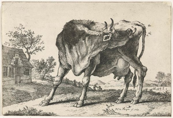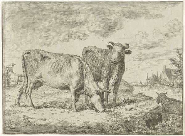 Curator: It has a strangely calm feeling, doesn't it? A very ordinary calm. Editor: It does, in fact. And that captures something quintessentially Dutch, wouldn’t you agree? What you're looking at is an engraving of two cows near a tree, likely from sometime between 1670 and 1720. The piece is part of the Rijksmuseum's collection, though its creator is anonymous. Curator: Anonymous, yes, though I can almost smell the cows just by looking. There's something almost touchable about that heavy beast resting in the grass. They really nailed that feeling of a hot afternoon, just idling away. The engraving captures a lot of what realism aims to offer, but something symbolic too. Editor: Indeed. The cows themselves can be read in myriad ways. Think about the era—Dutch Golden Age. Cows equal prosperity. They represent a sort of grounded abundance, the source of milk, butter, cheese—sustenance, obviously, but also a visual shorthand for national well-being. Their placement by the tree? A subtle echo of pastoral ideals and connection to the earth. It has connotations of biblical imagery and pre-Christian tree-of-life venerations. Curator: I never really thought of the political subtext behind it! But I can appreciate that reading; so a seemingly straightforward bucolic landscape gets transformed into something richer. You are right, the iconography goes much deeper once you start digging into it. I find it kind of charming. Editor: The appeal extends beyond that—consider the composition, the way the artist guides the viewer’s eye. It is skillfully done even in a piece where the focus appears deceptively casual. We carry so much baggage, personal and historical, and place it all when we view art. In a way, the real art comes from our interaction with the artist's creation. Curator: Well said. Next time I see a cow, I am definitely going to think a little harder about Golden Age prosperity and arboreal symbolism! Editor: Me too, me too. Every field suddenly looks ripe with potential narratives.