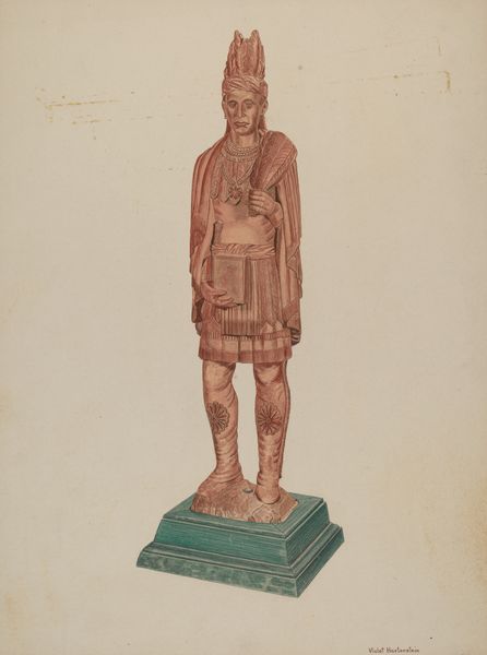 Editor: This is Walter Hochstrasser's "Cigar Store Indian," from around 1938. It looks like it's a drawing, maybe watercolor and charcoal. I'm really struck by the…the theatricality of it. The figure feels so staged, so deliberately "Indian." What's your take on this piece? Curator: Staged is the perfect word! There’s a performative element baked right into the subject matter. Those cigar store figures weren’t exactly known for their anthropological accuracy. It's like Hochstrasser is taking a second bite at a stereotype already past its prime. Editor: So, he’s commenting on the…the commercialization, the commodification of Indigenous identity? Curator: Perhaps, or maybe just fascinated by it. The colors are muted, almost melancholic, wouldn’t you agree? And the rendering, particularly the way the light hits the figure… it’s all so precise, almost lovingly so. It invites me to contemplate how stereotypes, however demeaning, are not fixed. Editor: Do you think he meant to reclaim the image somehow? Or at least humanize it? Curator: Humanize… I am not entirely convinced about it! The details are too careful, too intent on replicating a preconceived notion, and what I think is truly moving in the artist work, it is also really terrible... What do you see instead? Editor: Hmmm, interesting point, but isn't art is always stuck in the middle like that: great AND terrible at the same time! I guess it makes the conversation better. Curator: It surely does. Let us meet here again soon, shall we?