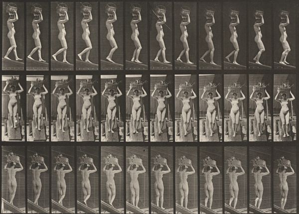 Eadweard Muybridge made this photographic study of a woman descending an incline in the late 19th century. The act of walking, seemingly simple, is laden with cultural weight. Here, the fragmented images reveal more than just movement; they dissect the human form, echoing ancient attempts to capture life's essence. Consider the Archaic smile of early Greek sculptures, a frozen expression meant to animate stone. Muybridge, similarly, freezes time to unlock the secrets of motion. The incline, a recurring motif in art history, symbolizes challenges and transitions. Think of Jacob's Ladder or the perilous descent into the underworld. Our collective memory associates such paths with profound change. Muybridge's subject, descending, evokes both vulnerability and determination. This descent is not merely physical; it suggests a psychological journey, tapping into our subconscious understanding of life's cyclical nature. Thus, this sequence resonates far beyond its scientific intent, engaging our emotions and ancestral memories of human endeavor.