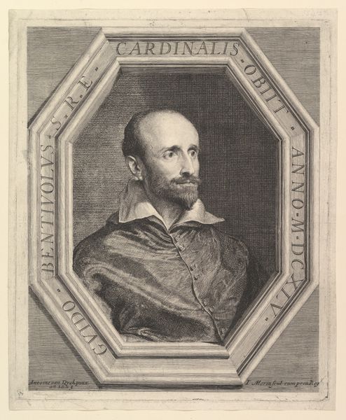 Curator: Immediately, I’m struck by the stark contrast and the intricate detail, particularly in the rendering of the Cardinal's face and the fabric of his robes. Editor: This is a print, "Portret van kardinaal Guido Bentivoglio", residing here at the Rijksmuseum. Wallerant Vaillant produced this between 1637 and 1677, using etching and engraving techniques. The texture achieved with the engraving seems incredibly complex, considering the time it was made. Curator: Absolutely. Think about the skill involved. Each line carefully etched or engraved, dictating not just form, but also value and texture. And those decisions, like emphasizing the fall of light on his collar, it gives it all such tangible presence. What power that imparts to the subject! I want to consider the distribution networks of this era and who controlled production and consumption of images. How might the availability of such portraits bolster a Cardinal’s image? Editor: Well, portraits such as these clearly served as vital propaganda. Consider the Cardinal’s role within the Catholic Church and broader European politics. This image would solidify his presence, visually reminding people of his authority and status in Baroque society. Think of how strategically such portraits would have been deployed within the Vatican or amongst noble families. Curator: Precisely. And to go back to the "how," examining the paper, the inks—tracing their provenance gives insight to Vaillant's network. How many hands did this work pass through to become accessible to the broader population? Printmaking enabled access but also depended on established social routes. Editor: That reminds us too that prints like these helped codify and circulate visual languages. Notice the way Vaillant employs standard portrait conventions of the era? The gaze, slightly averted, communicates intellect and piety but avoids confrontation. The composition suggests an image meticulously designed to convey power, which can, in fact, only achieve power within particular institutions and social structures. Curator: So it’s both about the object *and* the infrastructures around it. That interdisciplinary approach is essential. Editor: Exactly. Studying the history of imagery reveals that these kinds of aesthetic techniques have tangible social consequence. What better case study than a Cardinal consciously cultivated through imagery! Curator: Well, thinking about the physical act of creation gives even more resonance to the print, I see the labour as such a part of this Cardinal’s story now. Editor: Yes, it all folds together in a complex history.