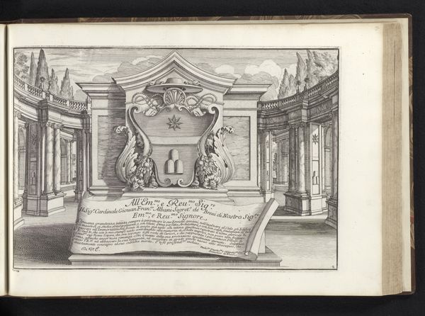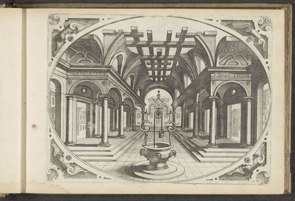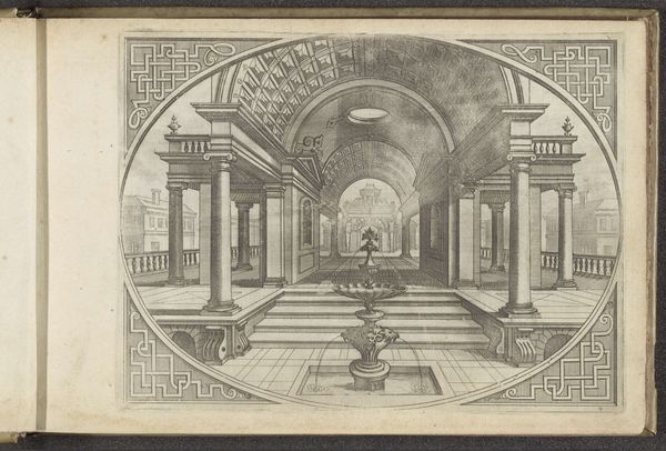 This is "Ronde tempel met centraal bassin en fontein", a print by Johannes or Lucas van Doetechum. During the 16th century in the Netherlands, artists like the van Doetechums were part of a society grappling with religious and political upheaval. The print illustrates a round temple with a central pool and fountain, all framed within an elaborate border. Imagine the sense of order and harmony the temple embodies, a stark contrast to the tumultuous times. The fountain, a source of life-giving water, invites us to reflect on themes of renewal and purity. How might such imagery resonate differently today? Reflecting on this print, it seems like a longing for stability amidst chaos. It bridges the emotional with the architectural, reminding us that art often serves as both a mirror and a sanctuary.