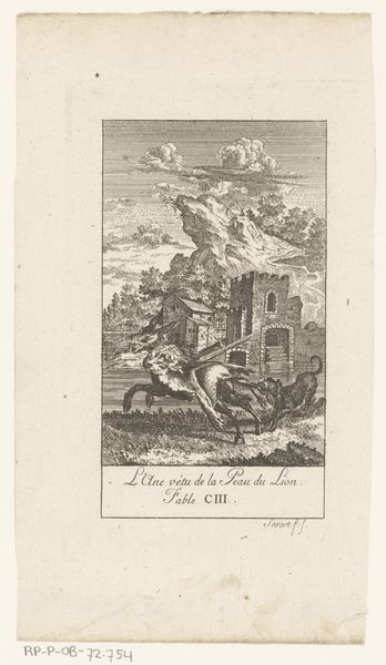Curator: Right, so we are looking at "Jupiter en de donder" or "Jupiter and the thunder," an engraving dating back to 1773, created by Reinier Vinkeles, and it is held here at the Rijksmuseum. Quite a dramatic little thing, isn’t it? Editor: Dramatic, definitely! My first impression is all about the raw power it captures, especially in that stormy sky. But also a bit... illustrative, almost staged? Is it me? Curator: I get what you mean. Vinkeles was, after all, an engraver often illustrating scenes and stories. I see the work in dialogue with baroque sensibilities in its grandiosity. Notice how Jupiter's dominance is reinforced by the chaotic scene below, full of fleeing figures near classical-style buildings. This all feeds into a wider discourse around power. Editor: Yes, definitely! And you know what also strikes me? Jupiter here isn’t just a powerful figure; he embodies authority and perhaps, inevitably, patriarchal power. What does it mean when supreme power is rendered as a virile, white male figure hurling lightning bolts? Who is left cowering? Where is Juno in all this?! Curator: Well, allegorically speaking, perhaps Vinkeles wasn’t aiming for nuanced social commentary! Maybe he simply sought to convey the sublime terror—and yes, masculine potency—of the god. Editor: Sublimity and power, gendered. Okay. What’s the tale being referenced here? I can’t quite make it out. Is there a specific mythological event Vinkeles is illustrating, or is it a generic depiction of Jupiter asserting his dominion? Curator: Ah, I suspect the engraving accompanies a fable. That frame just above the inscription references the fable number CLXII. Perhaps that might illuminate a more specific context. Editor: Regardless of the particular story, I think situating this piece within broader discussions of visual representation, specifically relating to gender, power and the politics of seeing, remains critical. Otherwise, are we simply perpetuating unquestioned norms? Curator: Well, whatever Vinkeles might have been thinking at the time, the print definitely holds different meanings and raises pertinent questions today, wouldn’t you agree? Editor: Absolutely! That tension between its historical context and our contemporary lens is what makes discussing artworks like this so stimulating.