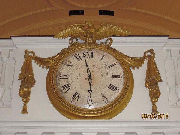Curator: Initially, I'm struck by the sheer monumentality and its imposing form. Editor: Agreed! This "Tall Case Clock (giant)" is an anonymous work, but its presence speaks volumes about power and control. Curator: Precisely. Consider the clock’s symmetrical architecture—the columns, the pediment—classical allusions that signify order and reason. Editor: But who benefits from that order? The wealthy landowners, certainly, who could afford such a status symbol. Time becomes a commodity. Curator: We can also appreciate the craftsmanship, though. The intricate carvings flanking the central panel demonstrate the maker's skillful hand. Editor: It's a beautiful object, yes, but let’s not forget the unpaid labor that may have contributed to its creation, the exploitation of human beings involved in the trade of materials. Curator: It prompts a deeper consideration of the layers of meaning in the design and execution. Editor: Indeed. This clock reminds us to reflect on whose time is valued and whose is not, even today.