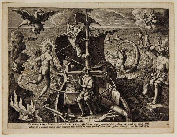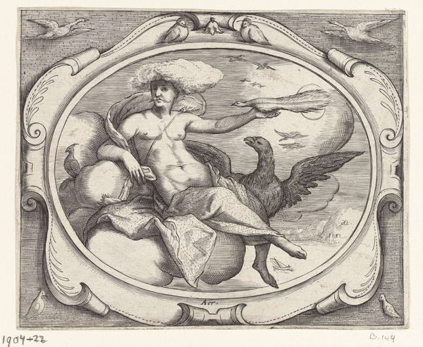 Curator: Adriaen Collaert's "Africa," a striking engraving, presents a symbolic representation of the continent. Editor: It's a wild composition! She sits astride a crocodile, draped, while the backdrop teems with wildlife. An odd mix of power and vulnerability. Curator: These allegorical prints, popular in the 16th century, weren't about accurate depiction. Collaert's "Africa" speaks to European ideas about the continent. Editor: Right, it's a projection. The details—the pyramids, the exotic animals—construct a narrative that reinforced Eurocentric views. I can almost hear the whispers of "exoticism". Curator: Precisely. The figure embodies both fertility and submission, reflecting the complex relationship between Europe and the "Dark Continent". Editor: Ultimately, it's a gorgeous piece, though its inherent biases are hard to ignore. It’s fascinating, as an artefact of its time. Curator: Indeed. It reminds us to critically examine the lens through which we view other cultures, past and present.