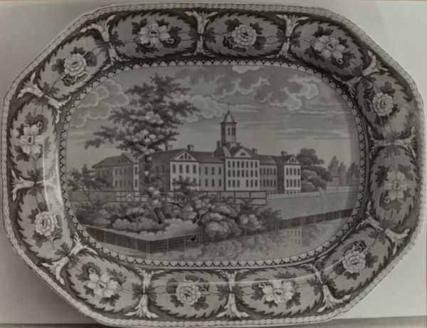 Curator: Here we have a Platter, made sometime between 1837 and 1857 by William Ridgway & Co. It’s currently held at the Metropolitan Museum of Art. Editor: It's quaint! The grayscale scene is simple but feels inviting. The symmetrical image placement gives it a sense of stability, perhaps echoing the structure depicted. Curator: This piece, rendered in earthenware with a printed design, really speaks to the burgeoning middle class and their aspirations. Imagine, a relatively accessible piece of decorative ware depicting an iconic landmark! The transfer print technology allowed for mass production and wider consumption. Editor: You’re right, the symmetry does point to larger, organizing principles in the visual scheme. Note the balanced weight of the domed building against the open park space. Even the linear marks suggesting clouds in the background reinforce this deliberate composition. Curator: Absolutely. This wasn’t just about aesthetic pleasure, but also about displaying status and perhaps even a connection to the broader political landscape. Think about how such objects circulated – impacting tastes and even spreading political ideas. Editor: That repetition of forms also appears within the building itself; columns, windows, the repeated spherical domes—suggesting power through uniformity. What statements might the landscape also present, visually contrasting natural life and civic constructions? Curator: Well, this brings up interesting questions of the labor involved. Consider the workers involved in mining the clay, shaping the earthenware, creating the print... It highlights the relationship between industrial production, consumer culture, and the everyday lives of 19th-century citizens. Editor: All that human input, channeled into one visually balanced presentation of ideal social life and values, it seems. Curator: Exactly. Thinking about how the "everyday" platter also carried and presented ideals through mass production highlights social connections so often hidden in museum settings. Editor: Fascinating. Looking beyond immediate aesthetics offers some potent cultural information embedded right here.