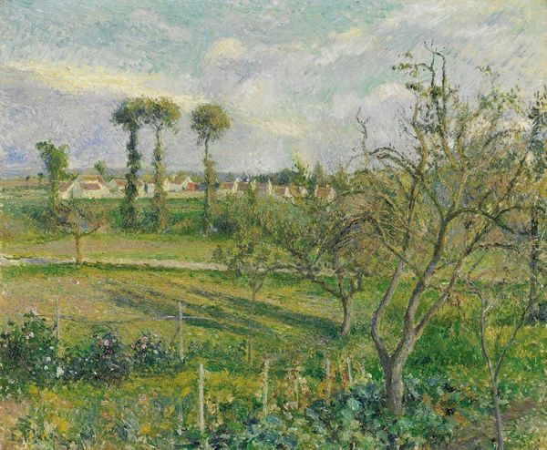 Curator: This piece is Claude Monet's "Springtime at Giverny," created in 1886. What do you see in it? Editor: I see a memory—a feeling of dappled sunlight and soft growth, filtered through an intensely personal lens. The color is riotous. Curator: Absolutely, Monet’s works offer fertile ground to explore identity and representation, and his Giverny period speaks volumes. Think about it: what does choosing to depict his own carefully curated natural landscape say about the artist’s self-fashioning and position within the cultural landscape of 19th-century France? Editor: I am intrigued by the prevalence of that vibrant red in the home’s rooftop; in juxtaposition with the delicate whites and blues of the blossoming trees, that hue is an anchor for my eye and possibly the painter's consciousness, evoking a specific place in both reality and imagination. What symbols were potent for Monet at that stage in his personal history? Curator: Well, Giverny marked a significant chapter for him, signalling newfound financial stability and artistic recognition. That’s something important to keep in mind when considering how nature serves not only as inspiration for a painter, but also as an instrument in class mobility. Did these spaces allow room for greater agency among artists, who might reimagine themselves? Editor: He transformed external experiences into subjective and symbolic forms. Every bloom feels like a coded letter in Monet's language. He repeats motifs that seem almost dreamlike as they appear over time in similar renditions of these settings; this repetition gives us permission to dive even more deeply into an analysis that isn't just about art but also history, culture, psychology and more. Curator: Exactly! We must not disconnect aesthetic expression from its socio-historical roots; consider for example how depictions of idyllic landscapes played into complex colonial fantasies in this same era! It becomes so obvious how seemingly simple visual impressions serve bigger purposes than just 'beauty.' Editor: Yes, it shows that artists shape their self-perceptions by how they choose particular environments; meanwhile their symbols grow along familiar yet unpredictable paths of their interior terrain--and for us as beholders too--that is beautiful to see. Curator: Thinking through those historical tensions and Monet's agency allows us richer understanding about these masterpieces. Editor: Precisely – letting our gaze and contemplation follow pathways towards personal associations in memory lets new symbolic resonances grow as naturally, too.
