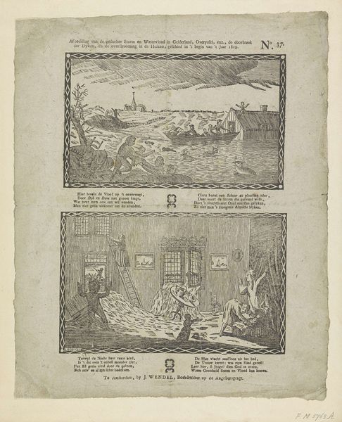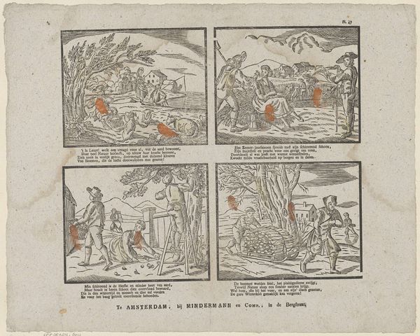 Curator: I’m struck by the stark contrast in this print. The dark lines carving out these violent hunting scenes against the bright paper—it's incredibly evocative. Editor: Yes, "Jachttaferelen," or "Hunting Scenes," created sometime between 1822 and 1849. The Rijksmuseum holds this piece, attributed to I.I. de Lanier. It’s an engraving, combining line work with, seemingly, text elements… let's explore those social implications a bit further, shall we? Curator: Immediately I am curious about the conditions of labor used in production of these types of artworks for sale, because the prints suggest it was for mass consumption. Given the date and subject matter, it’s tempting to ask what the work itself consumed in materials and labor; how were these engravings disseminated? Editor: Interesting. I look at this image differently: note the triptych arrangement. Three separate but connected vignettes, each showcasing a different stage or style of the hunt, from ambush to the hounds in pursuit, really speaks to the cultural significance placed on the ritual of the hunt at this time, yes? Genre painting allowed a burgeoning urban population glimpses into upper-class culture. Curator: True. We should not forget that engraving involves very specialized tools and practices; I wonder what type of workshop produced these prints. Was it small, family-owned studio or a large, more industrialized operation? What was the system in place in Amsterdam for art production at that time? These factors affect both aesthetic outcomes, and more granular realities such as economic relations in Amsterdam... Editor: Exactly; now it’s hanging in the Rijksmuseum as part of their permanent collection—a far cry from its initial context and purpose. Now considered fine art. Do you think its current placement influences our perception? Curator: Without a doubt! By preserving this engraving within its walls and safeguarding access today the Rijksmuseum plays a part in shaping—perhaps legitimizing or cementing—the dominant historical narrative concerning Dutch cultural life. Editor: Indeed. Viewing these prints helps us remember the powerful social institutions that curate memories.