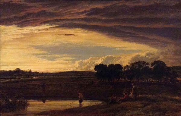John Linnell created this oil on canvas titled "Evening," which resides at the Minneapolis Institute of Art. At first glance, the composition evokes a sense of drama as the eye is pulled upwards, from the serene lower landscape to the tumultuous sky filled with dark, heavy clouds. Linnell's use of light and shadow isn't merely representational; it functions as a semiotic device, encoding deeper meanings. The contrast between the illuminated foreground and the brooding sky creates a visual dialectic, a conversation between tranquility and impending storm. The careful distribution of figures along the lower part of the painting is less about representing an idyllic scene and more about using human forms as anchors within the landscape, giving scale to the natural elements. Consider how Linnell destabilizes the traditional romantic landscape, which often celebrated the sublime harmony of nature. Here, the formal structure of the painting introduces conflict, using the visual language of light and shadow to question any easy sense of natural equilibrium. This creates an emotional tension, inviting viewers to contemplate themes of change and uncertainty.